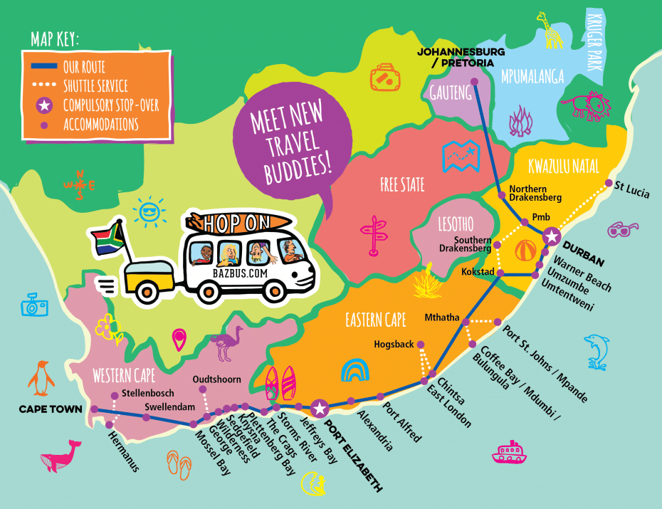 Simply buy one ticket to your final destination and hop on and off as often as you like along the route. You get picked up and dropped off at the door of your accommodation. There are over 200 establishments to choose from (backpacker hostels, guest houses, lodges & hotels) and more than 40 cities, towns or villages to visit. You can travel in one direction until you reach your final destination. There is no time limit on your ticket!