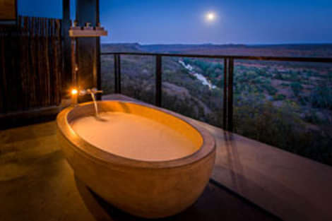 Located on the side of a sandstone ridge, the 12 Luxury Guest rooms have incredible views over the Luvuvhu River valley with guests often enjoying good sightings of elephant and buffalo coming down to water in the shallow waters of the river. Guests are able to enjoy the spacious luxury rooms with little to disturb the tranquility apart from the haunting cries of the Jackals and Hyenas in the early evenings.